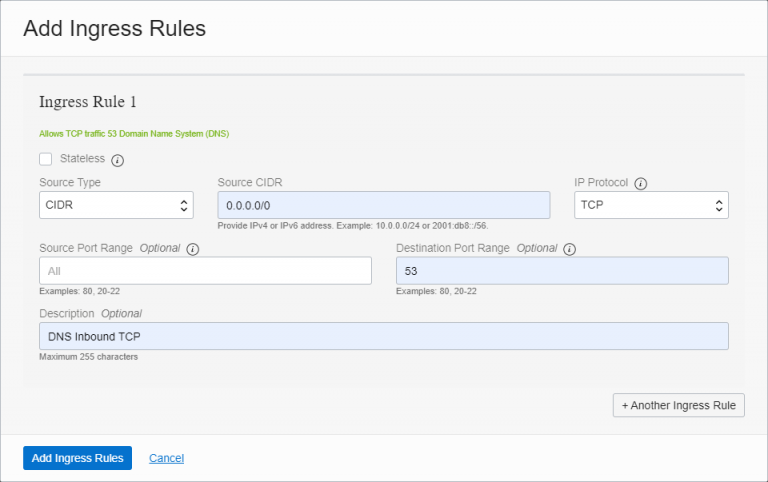 The second set to port forwarding in Oracle Cloud is adding an exception rule in the VCN associated with the VM. To do so simply navigate to the Default Security List for the VCN and click on the “Add Ingress Rule” button. You can use the picture below as a guide as to how to configure your rule. The rule in the example will open the port 53 which we previously added to the VM iptable as described above.