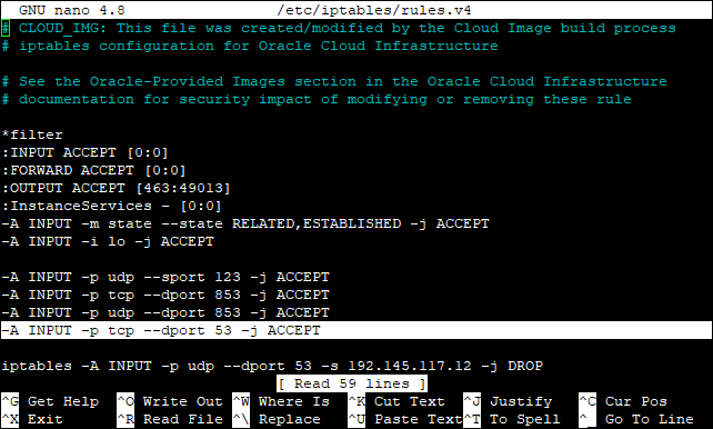 In an OCI ubuntu instance there are two iptables, an IPv4 and an IPv6 table. To add an exception for a VM on the iptables use one of the following commands to first be able to edit the appropriate table using Nano.
